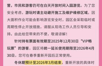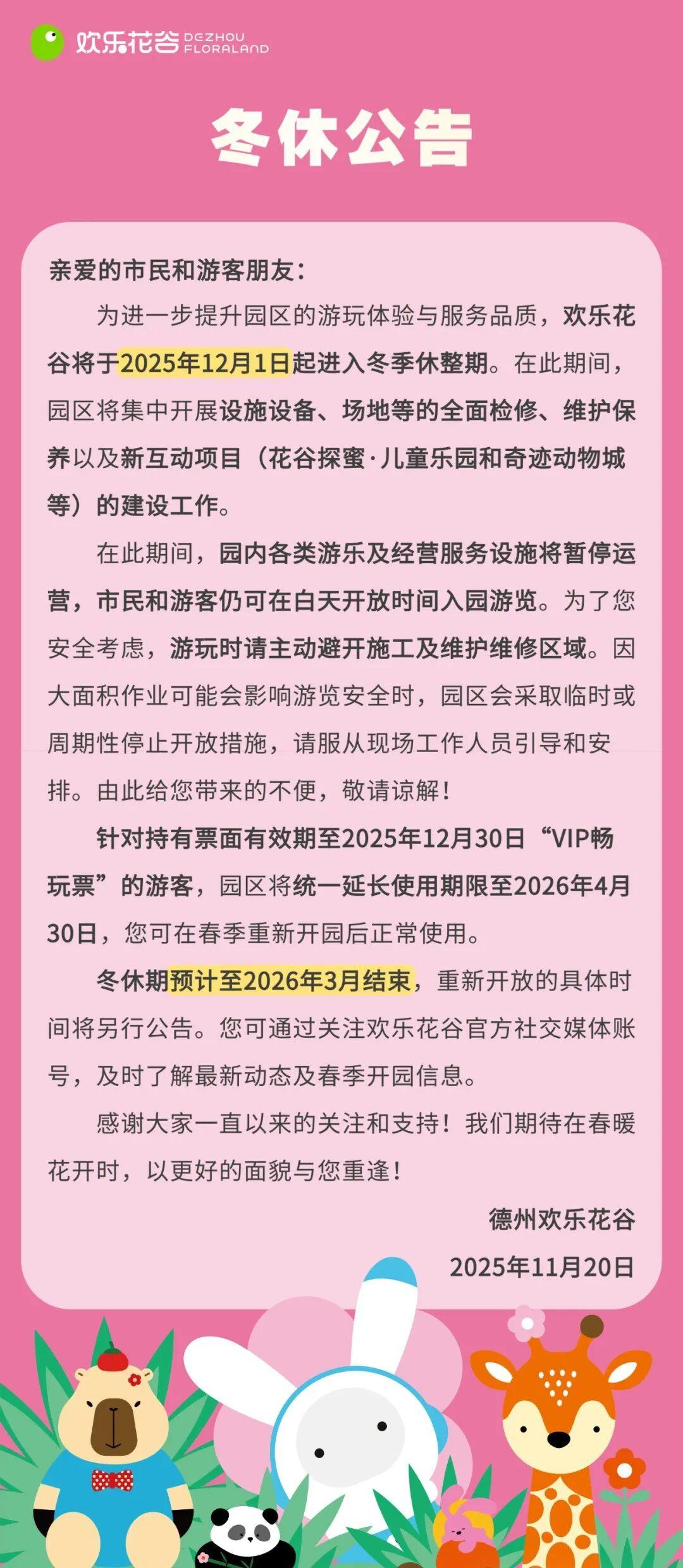 为保障园区设施安全运行,提升游览体验,乾兆花海将于2025年12月1日(周一)起临时闭园,园区将进行全面维护及环境优化工作,恢复开园时间另行通知。