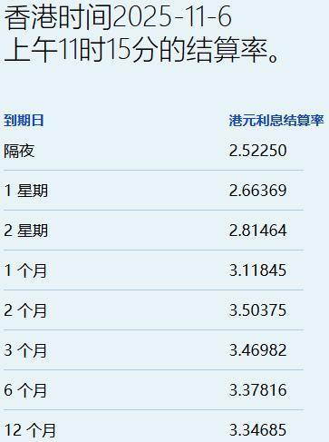智通财经APP获悉,11月6日,港元拆息普遍向下,而与楼按相关的一个月拆息连跌四日,报3.11845%,跌4.286基点;反映银行资金成本的三个月拆息报3.46982%牛鑫所,升1.696基点。
