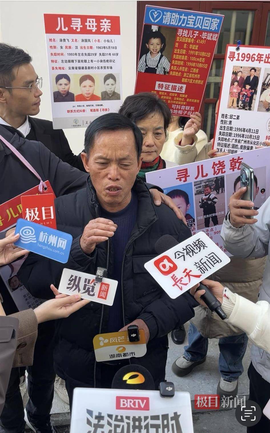 11月28日,江西赣州于都县,梁三寿站在老家门口,被人群团团围住。他身前是十多家媒体记者,身后是手持寻亲牌的寻亲家长与爱心人士,这场团圆时刻,也成了一众寻亲家庭的希望寄托。